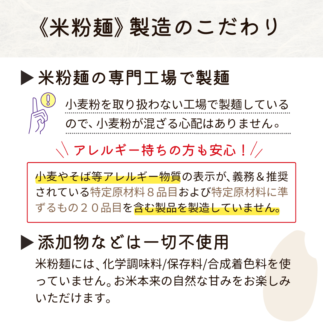 ※米粉麺は米粉を使い、でん粉を麺のつなぎに用いて製麺するため、原材料を2つのみに絞りました。添加物は一切使用していません。