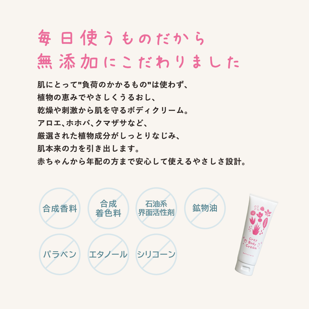 敏感肌OK、全身用、合成香料・防腐剤不使用。