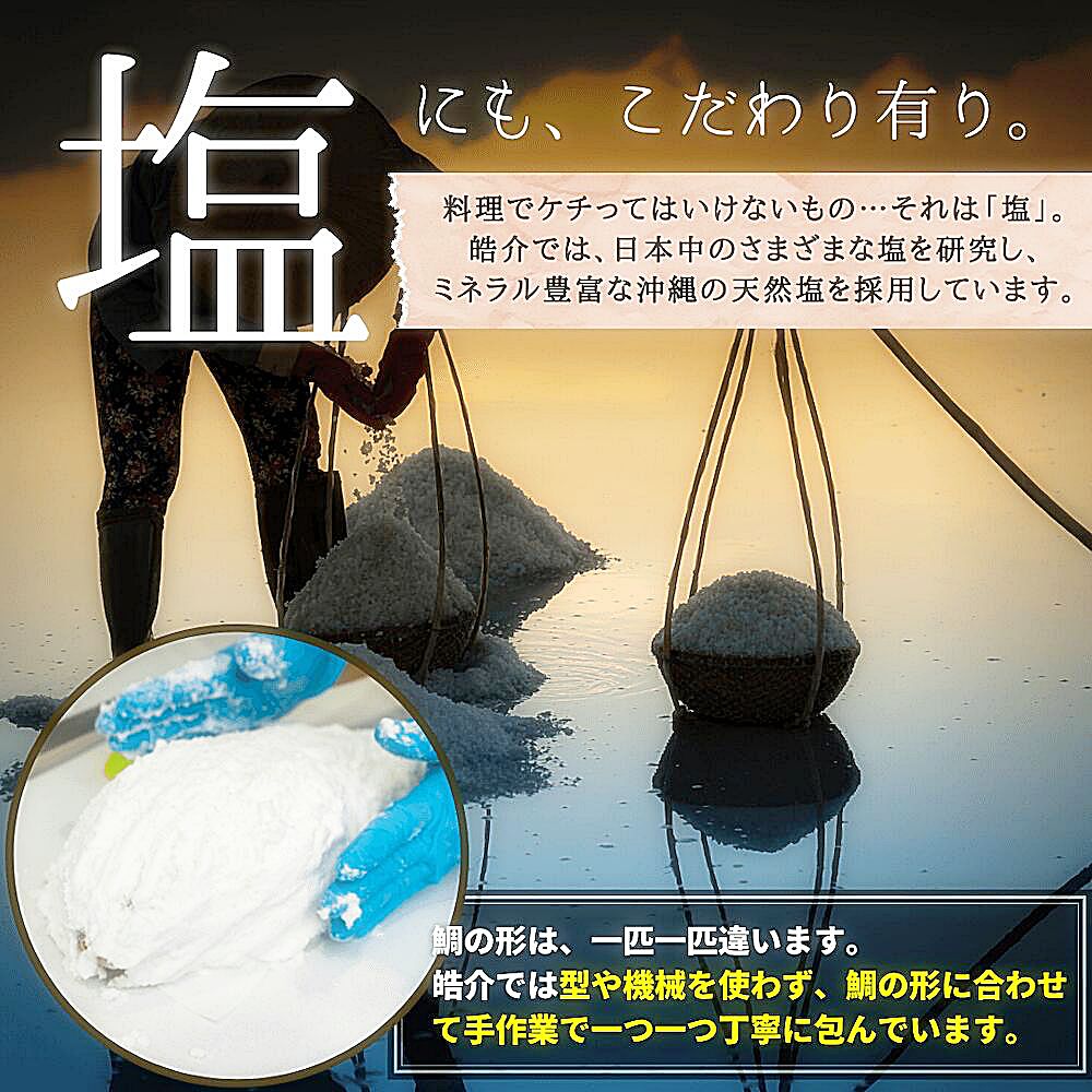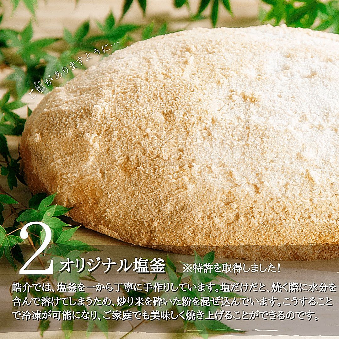 「美味しい鯛の塩釜を届けたい!」という思いから発明されたオリジナルの塩釜の技法は、2021年に特許を取得。炒り米粉を加えた独自配合により、加熱しても塩釜は全く溶けません。1つ1つ手作りされる塩釜は、旨味と水分を逃さず、鯛をより美味しくふっくらと焼き上げます。焼きあがった身はぷりぷりです。