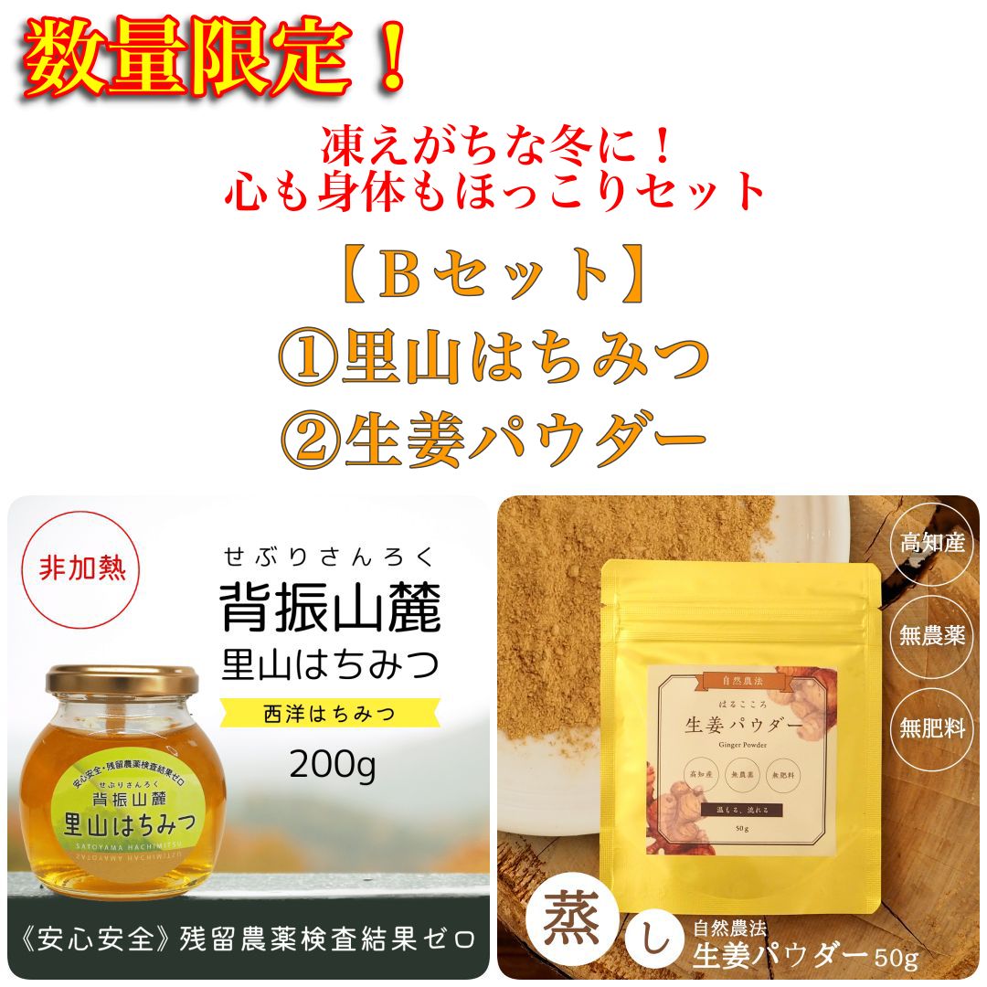 【数量限定】 凍えがちな冬に!心も身体もほっこりセット/(梔子50g、蒸し生姜パウダー50g、里山はちみつ200g の組み合わせ)