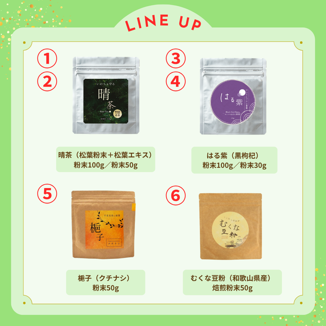 徳島県産赤松の松葉と松葉エキスを使った粉末茶。お湯にも水にも混ぜやすく、毎日の一杯におすすめです。 - はる紫100g / はる紫30g